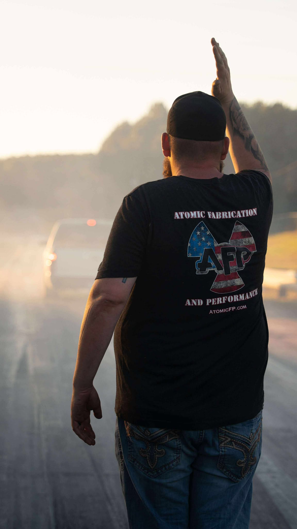 AFP Black T-Shirt tri-blend. The material is high quality/comfortable and very soft and size runs true to size to a little snug.